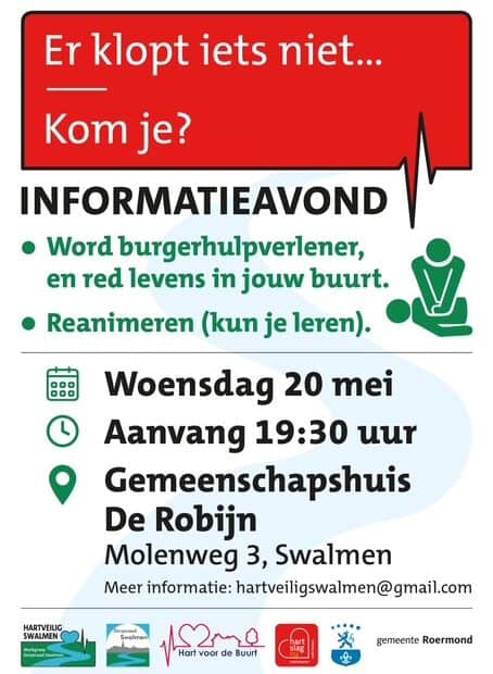 Wist je dat je met eenvoudige handelingen het verschil kunt maken tussen leven en dood? Op 20 mei organiseren we een gratis informatieavond over reanimatie, het… Lees verder »20 mei, infoavond reanimatie en burgerhulpverlening